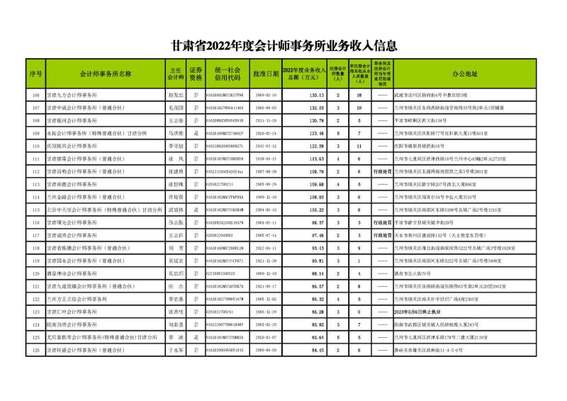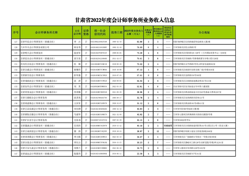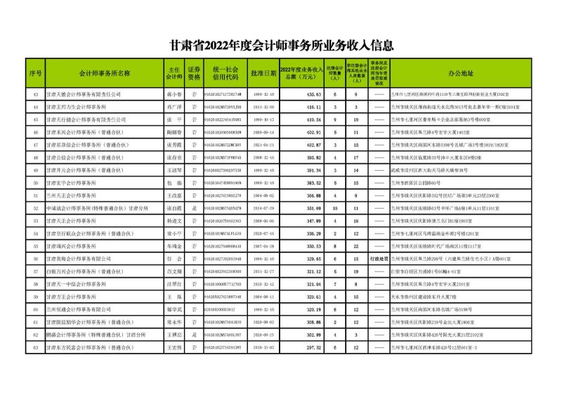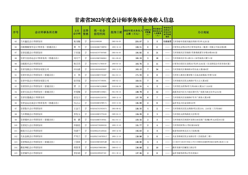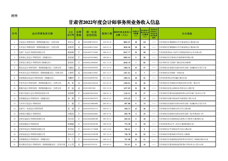 根據(jù)《甘肅省會計師事務(wù)所年度業(yè)務(wù)收入信息發(fā)布辦法》(甘會協(xié)[2021]10號),現(xiàn)將甘肅省2022年度會計師事務(wù)所業(yè)務(wù)收入信息予以發(fā)布